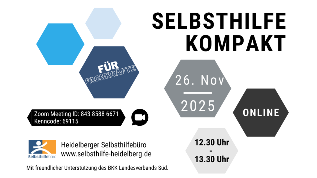 Mit dem Projekt „Selbsthilfe kompakt – Ein Einblick in die Selbsthilfe“ möchten wir einen lebendigen Zugang zur Selbsthilfe schaffen. Ziel ist es, Fachkräften in Beratungsstellen, Kliniksozialdiensten, Gesundheitsämtern und sozialen Einrichtungen im Raum Heidelberg und dem Rhein-Neckar-Kreis ebenso wie interessierten Bürger:innen die Bedeutung und Funktionsweise der Selbsthilfe näherzubringen. Die Veranstaltungsreihe zeigt, dass Selbsthilfe weit mehr ist als ein Ort des Austauschs – sie ist ein Raum der Begegnung, der Eigenverantwortung und der gegenseitigen Ermutigung.